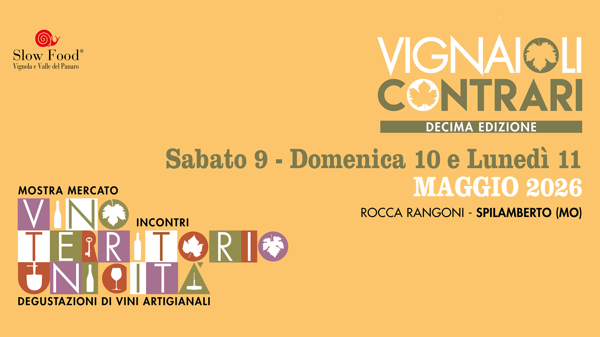 La 10° edizione di Vignaioli contrari si terrà dal 9 all’11 Maggio 2026 nella splendida cornice di Rocca Rangoni a Spilamberto. A presto il programma completo e tutti i dettagli.